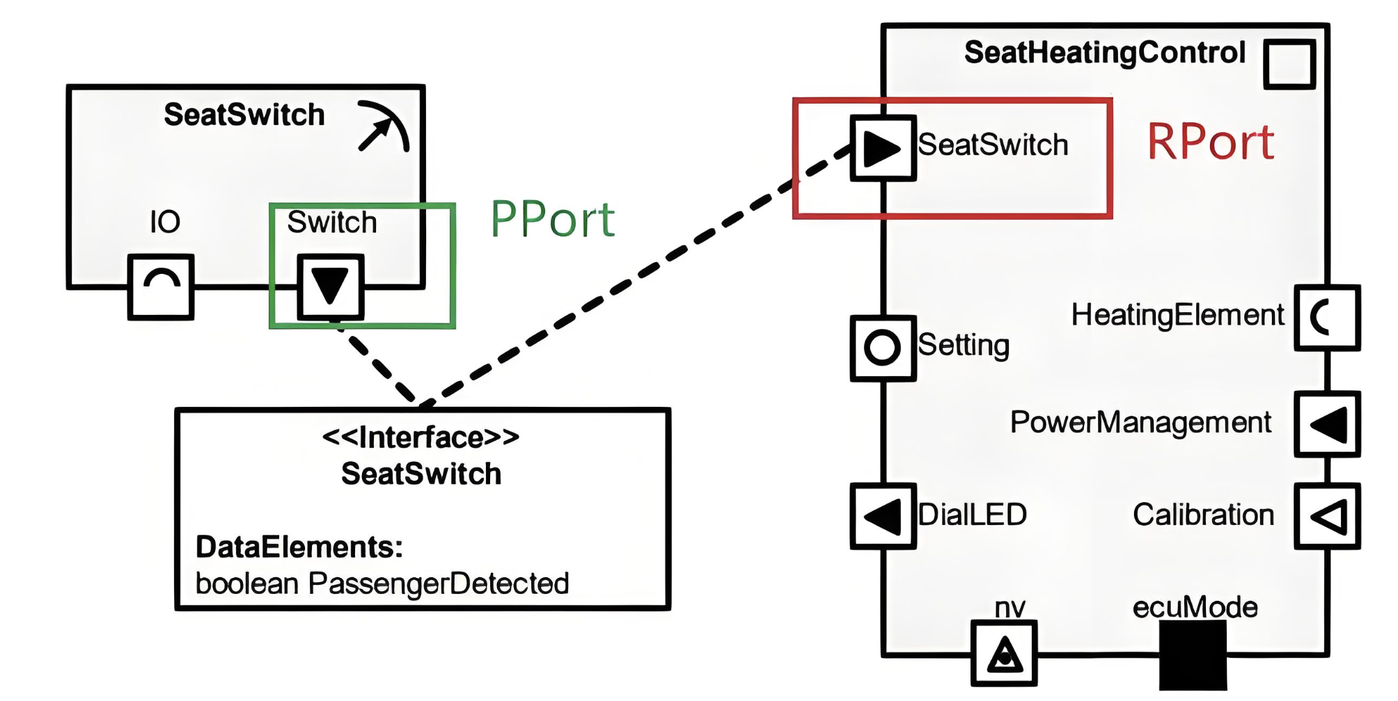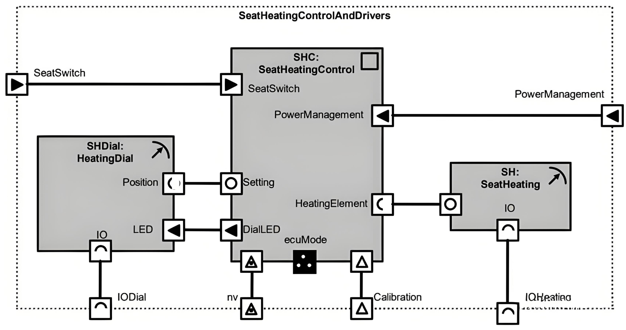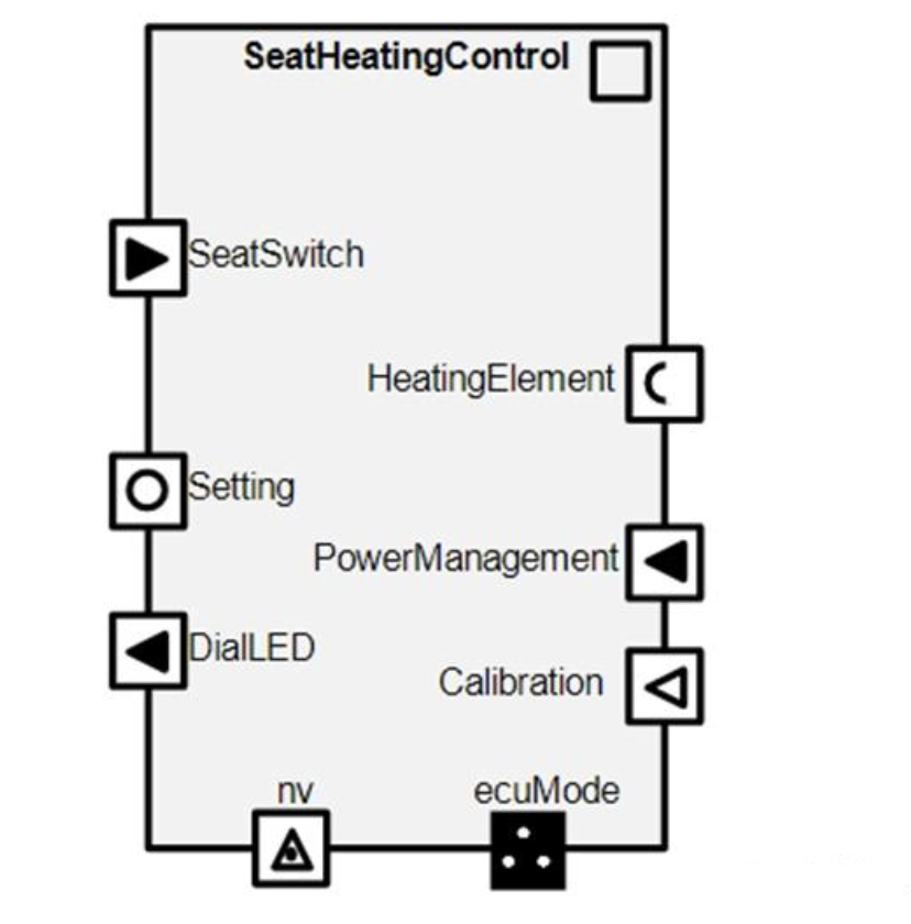 组件可以有多个端口,如下图,显示了一个“座椅加热控制”的组件类型的定义示例,该组件类型基于几个信息源控制座位上的加热元件。