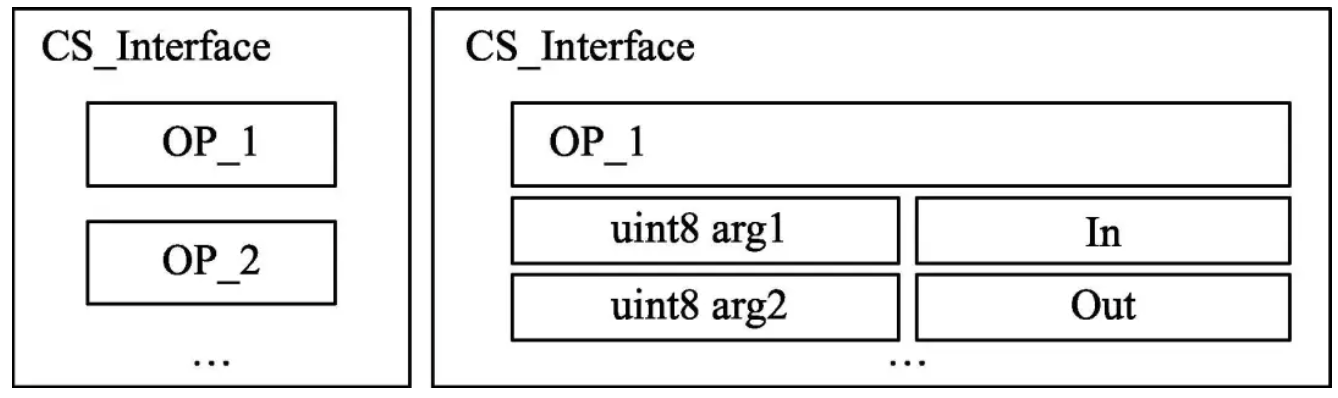 下图展示了客户端–服务器接口定义的两个操作OP1和OP2,并对每个操作都定义了相关参数和方向,即函数的形参。