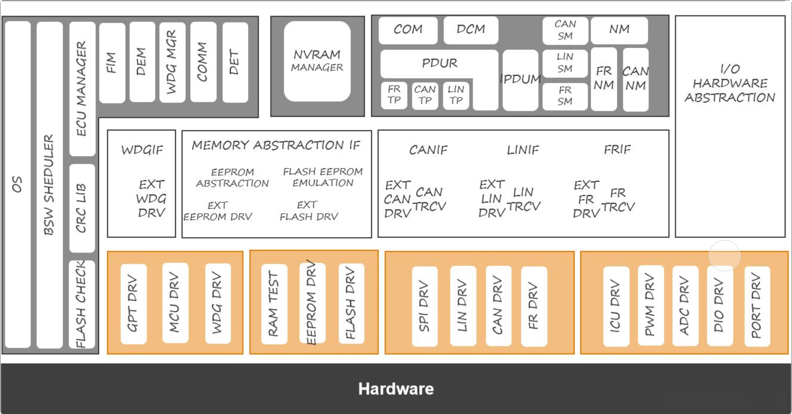 复杂驱动:又叫做CDD,主要工作是将AutoSAR未定义的一些功能封装起来,给应用层提供接口来调用这些功能,如果所有的车都按照定义好的结构来做,那整个汽车市场大概率是千篇一律了,我指的是从电子技术上来说的,抄个保时捷外壳不算在里面。