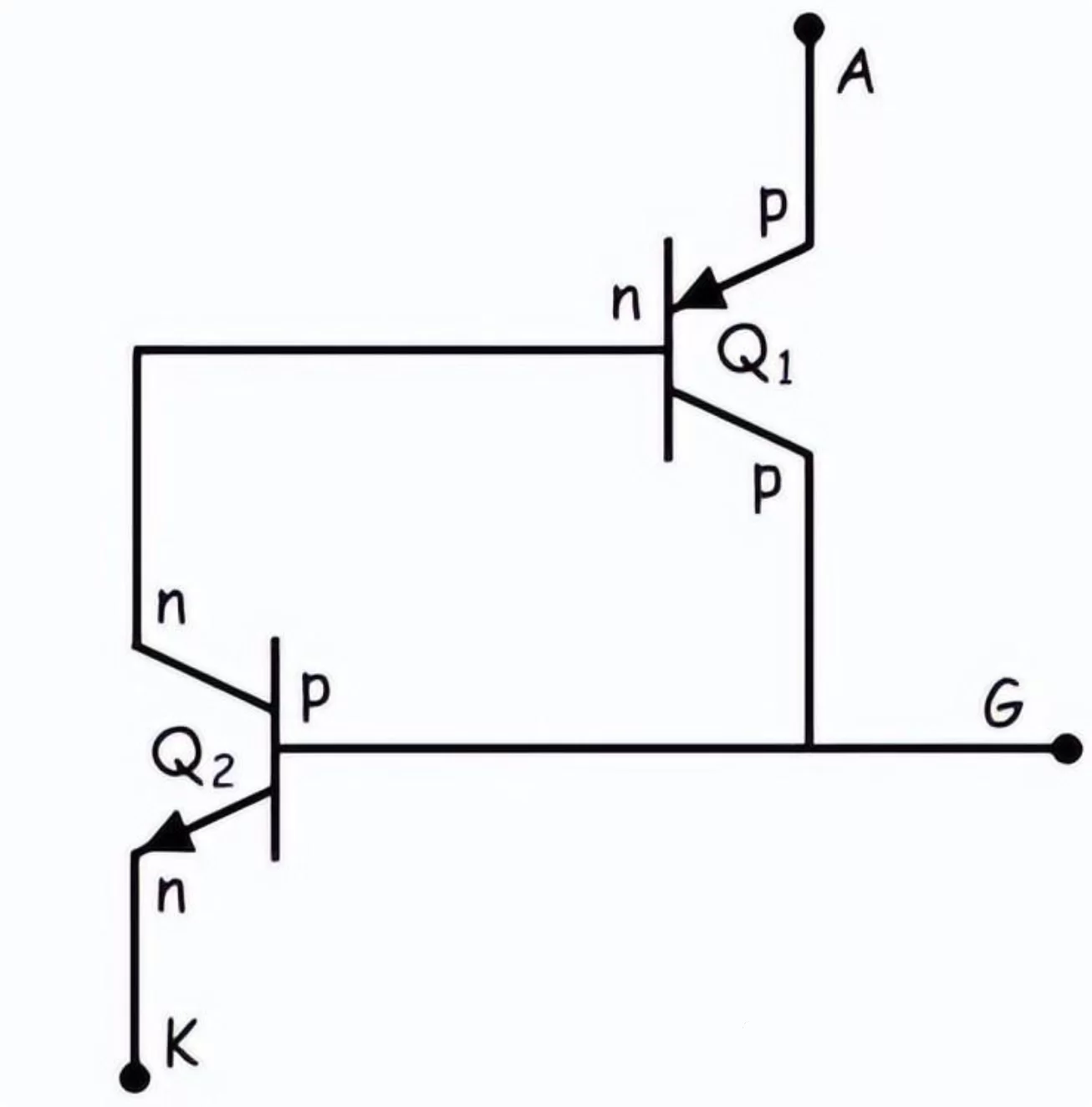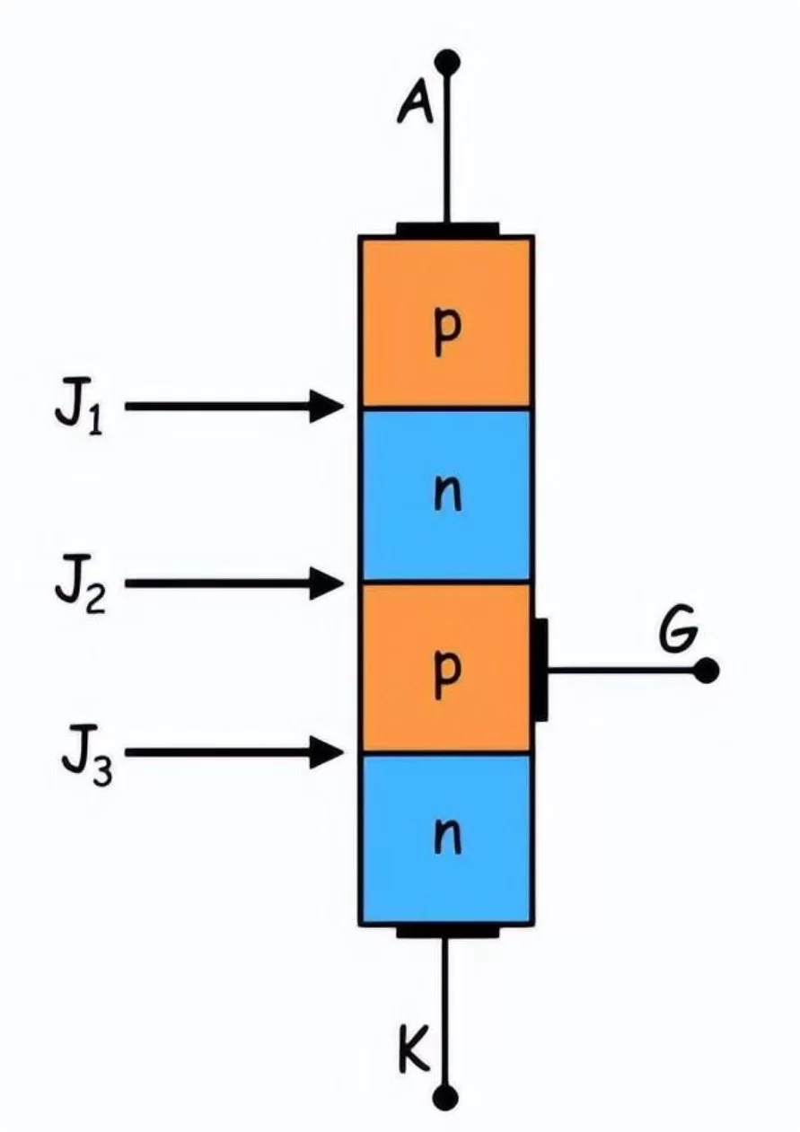 从结构上看,晶闸管内部形成了三个PN结(J1、J2、J3)。这种结构可以理解为两个晶体管背靠背连接在一起:一个PNP型晶体管和一个NPN型晶体管,它们的连接方式使得每个晶体管的输出成为另一个晶体管的输入。