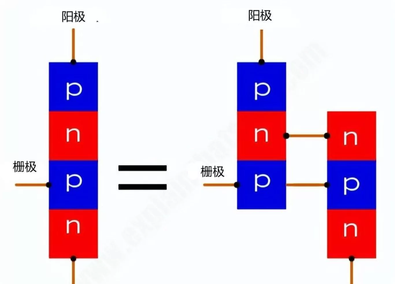 用两个三极管来等效一下,就会更容易理解它的导通过程。