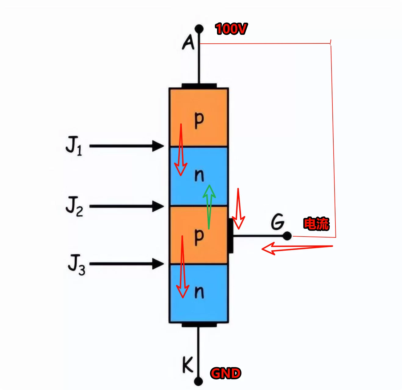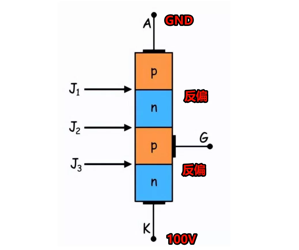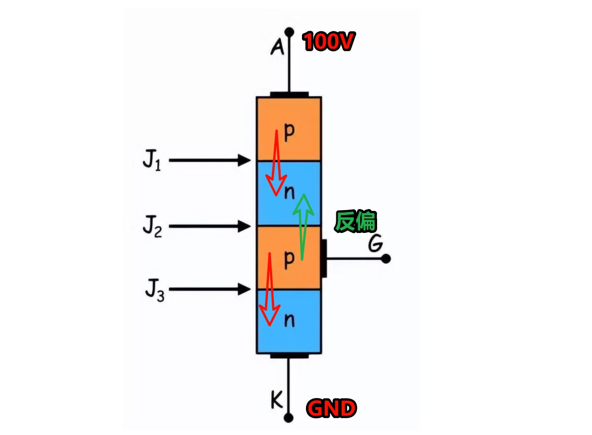 当我们把100V给它方向加上以后,也就是阳极加负电压,阴极加正电压时,情况与普通二极管反向偏置类似。两个外部PN结反向偏置,电流无法流通,晶闸管保持关断状态。