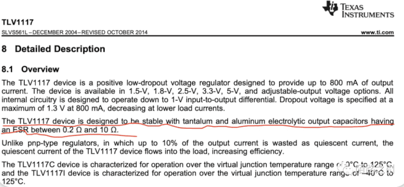 可以看到对于TLV1117来说,输出电容是有明确要求需要使用钽电容或者铝电解电容,并且特别说明了ESR需要在0.2Ω到10Ω之间。
